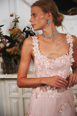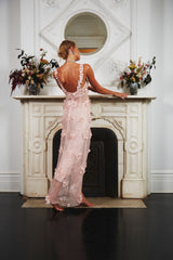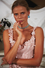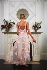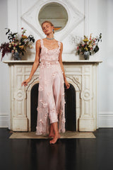 Our fluttering flowers are hand-dyed to achieve the very perfect shade of light pink, and are then hand-embellished with sparkling glass crystals on our whisper-soft chiffon. The entire gown is further hand-embroidered with small lotus flowers — in two shades of pink — and glittered with scattered crystals secured with silk threads.