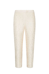 These trousers are made from 100% pure 80-gram raw silk and hand-embellished with glass crystals. Please care for with love and dry-clean only