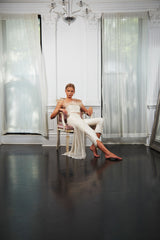 The Narcissus Trouser is hand-crafted from fine raw silk and hand-embellished with glass crystals, but also remains tailored and understated enough to allow for you to remain the star of the show. The hem of the trousers has a delicate tulip shape, highlighting the curve of the calf and the lengthening of the leg.