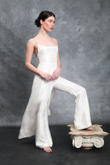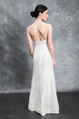 Sometimes elegance means understatement – but understatement doesn’t have to mean simplicity. This otherworldly gown, inspired by the queen of reinvented chic Bianca Jagger, is pure raw silk accented with tiny glimmering hand-embellished glass crystal straps and an over the thigh slit.
