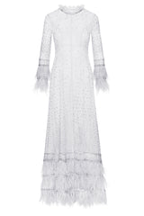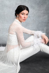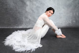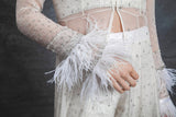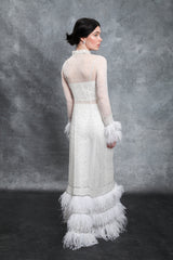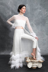 Tiers and tiers of fluffy white ostrich feathers, further enhanced by tiny iridescent crystals that catch the light with every shift and shimmy, transforming you into a shimmering goddess.