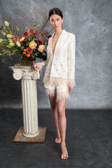 Easy movement and easy glamour define these shorts, just the qualities that defined their namesake, Elizabeth Taylor. Raw silk, sumptuous Ostrich feathers, and glimmering diamantés – you can’t go wrong.