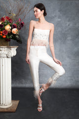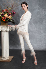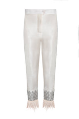 These raw silk trousers are a Parisian dream, from the hand-applied diamanté crystals that adorn the hem to the whimsical Ostrich feathers that complete the look. We like to think Elizabeth Taylor, the set’s namesake, would happily don these luxurious trousers.